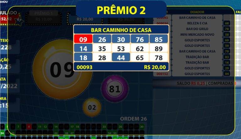 No exemplo acima a cartela foi premiada com o 2° Prêmio Kina acertando os números 09,26,30,76 e 86 na mesma linha.