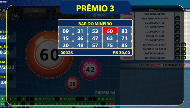 No exemplo acima a cartela foi premiada com o 3° Prêmio Keno acertando todos os números, sendo o número 60 o último a ser sorteado no total de 64 bolas sorteadas.